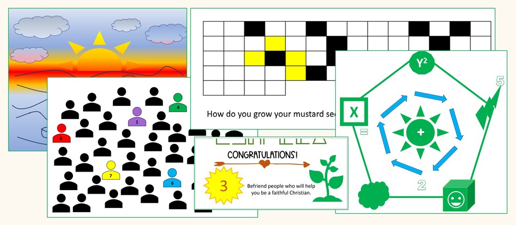 If you like "Escape" rooms and puzzle or mind games, you'll enjoy this Mustard Seed Game for Sunday School or Families. Five visual mind games will walk gamers through the concepts of growing their faith like a Mustard Seed. The participants solve the answers before moving on to the next challenge.