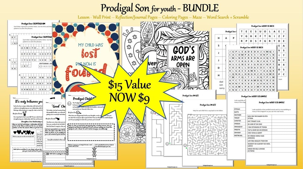 Best Value! All the youth Prodigal Son products are yours for one low price! Lesson guide, Journal/Reflection pages, Wall print, Coloring pages, Puzzle games.